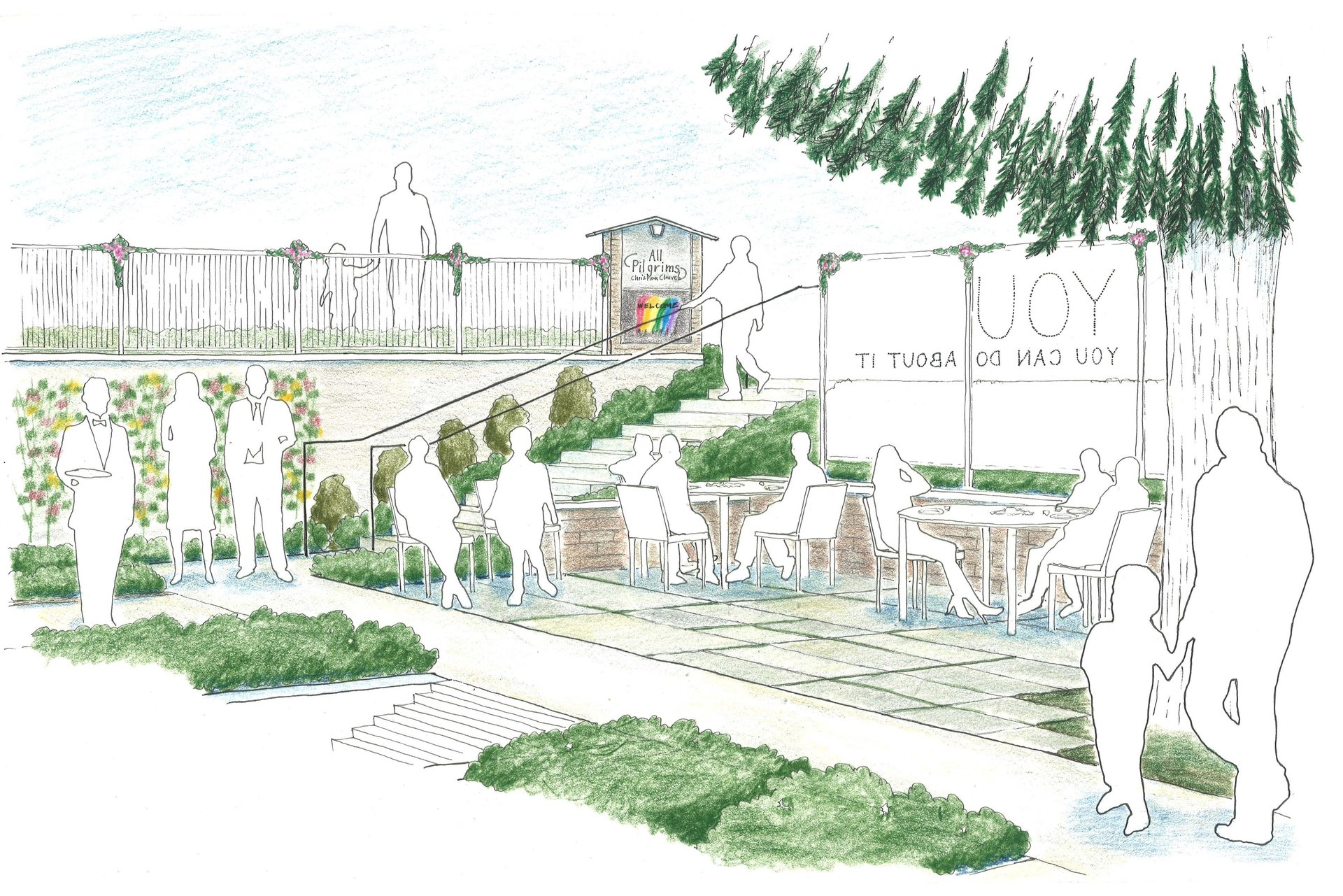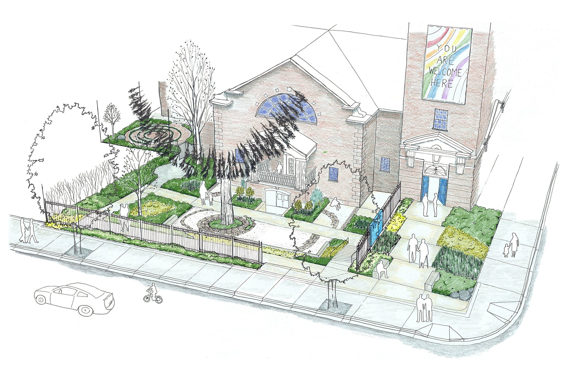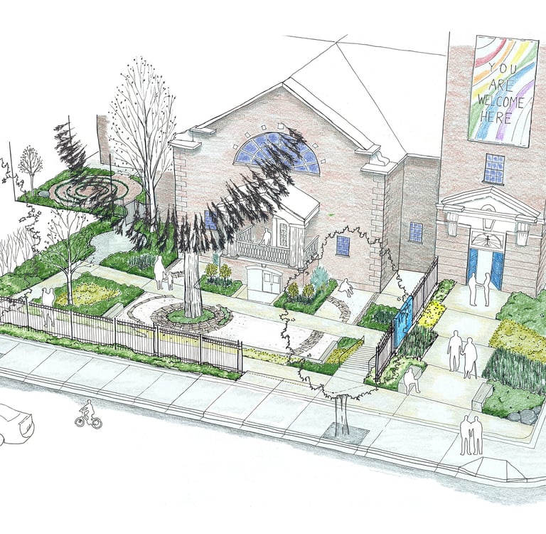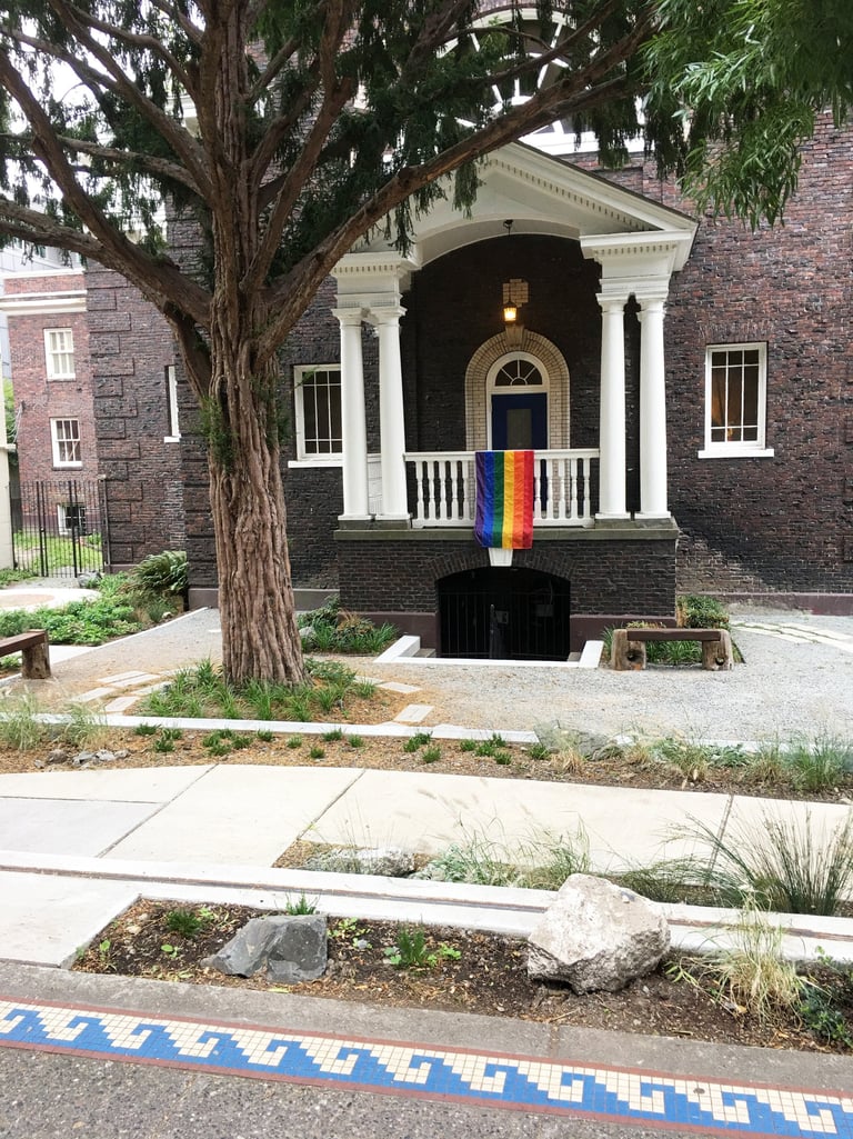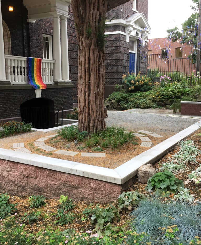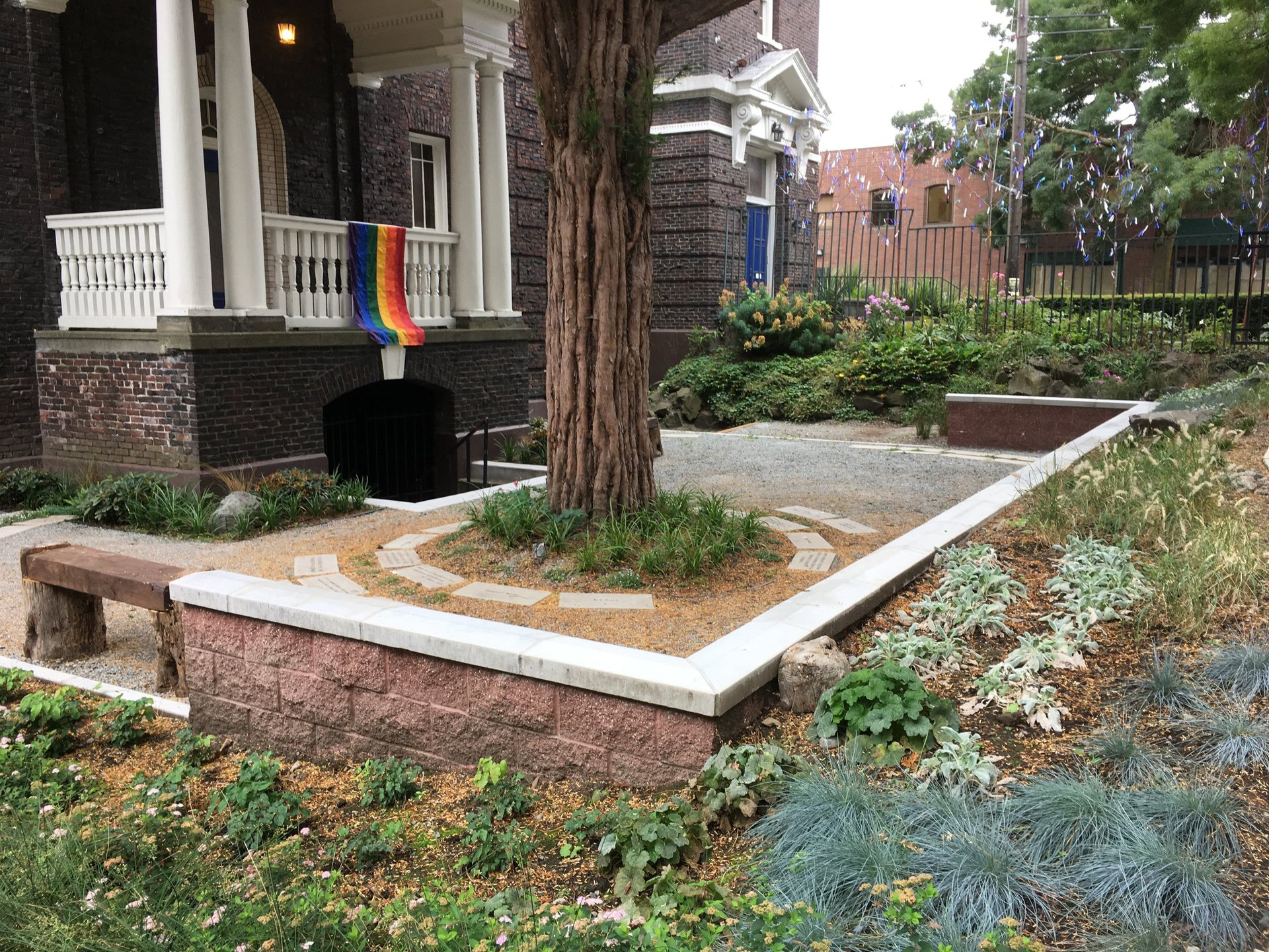The Same Love Garden celebrates marriage equality in an outdoor space conceived as an extension of the interior sanctuary hall. With help from singer Macklemore and many other donors and community members, the garden formed around an historic tree and includes a crushed rock gathering area, seat wall, and donor pavers around the tree, an impressive rolling gate along the street, and a ramp and stairs to maximize accessibility and welcoming of the church’s community members. A lush palette of plants serves both as a backdrop for weddings and a means to capture stormwater runoff.