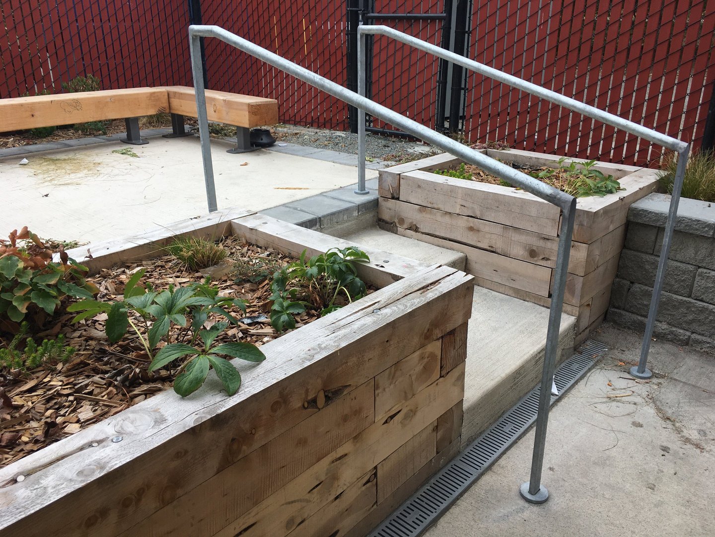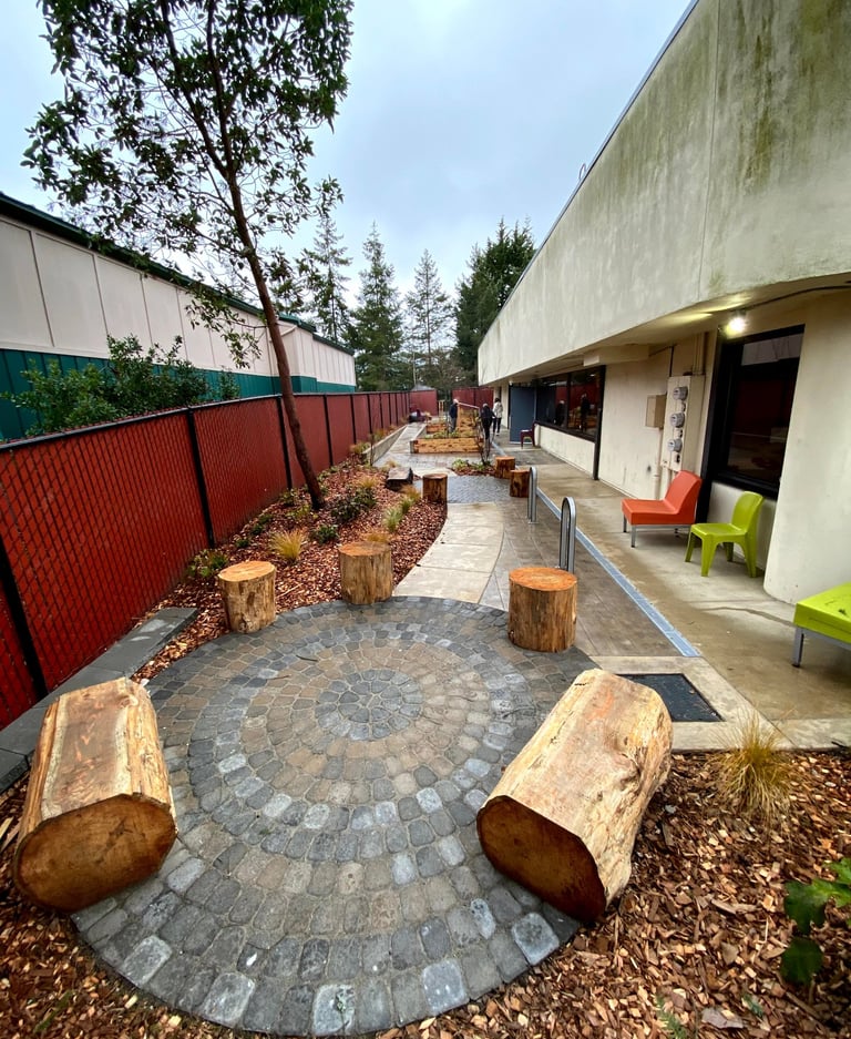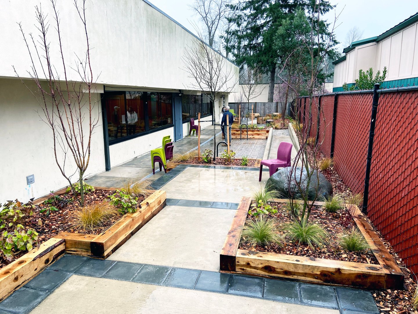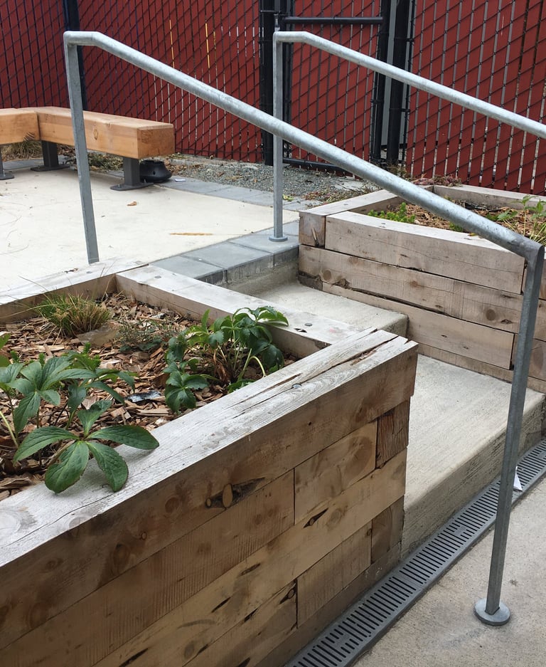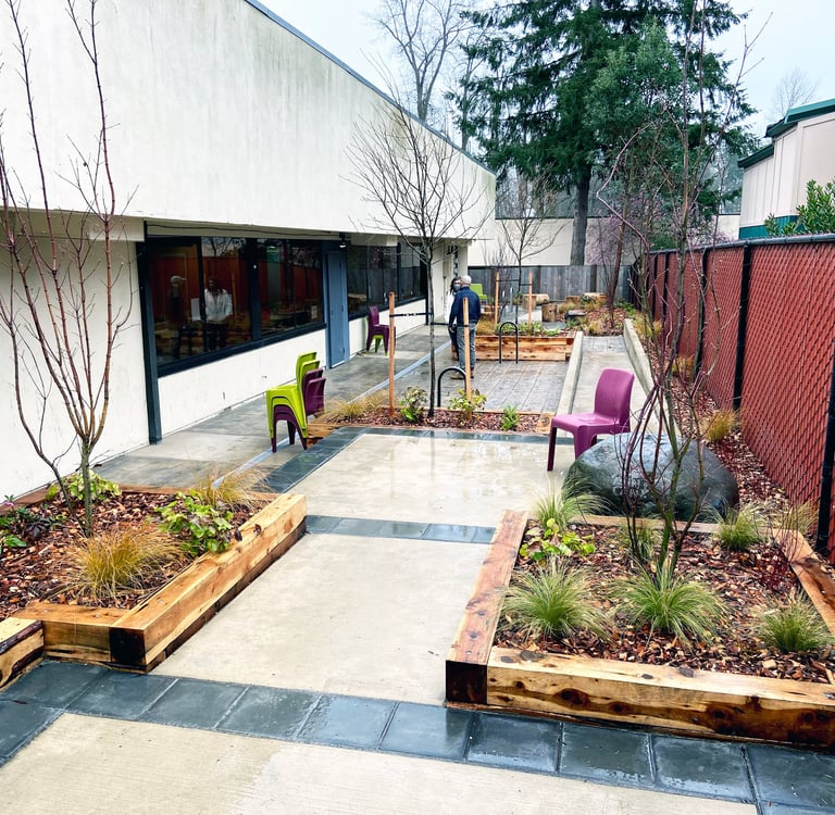 The Day Center provides a welcoming space to adults who are homeless, offering help with hygiene and laundry, technology and mail service, meal prep, health care access, and social services. Renovated during the Covid pandemic, the project includes garden planters, an accessible ramp and stairs, stamped concrete paving, and seat boulders, and emphasizes safe social distancing. A variety of spaces and furnishings allow for different users to find their own form of respite amongst plantings of trees and shrubs.
