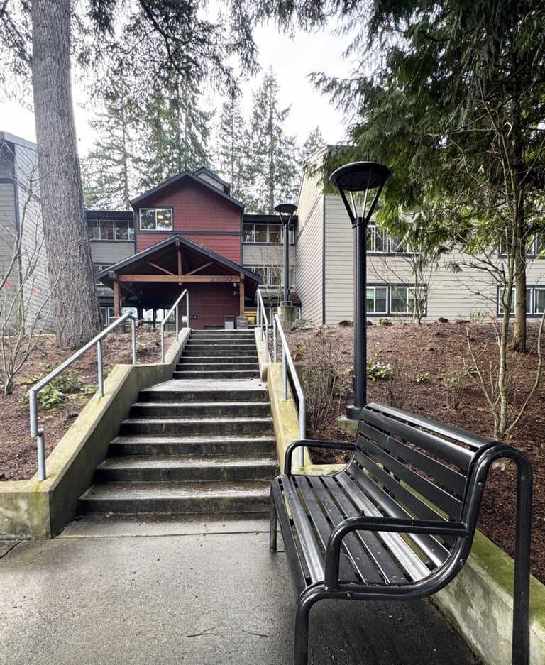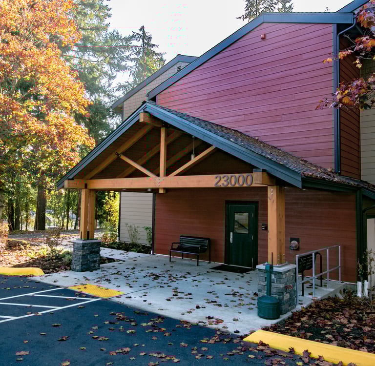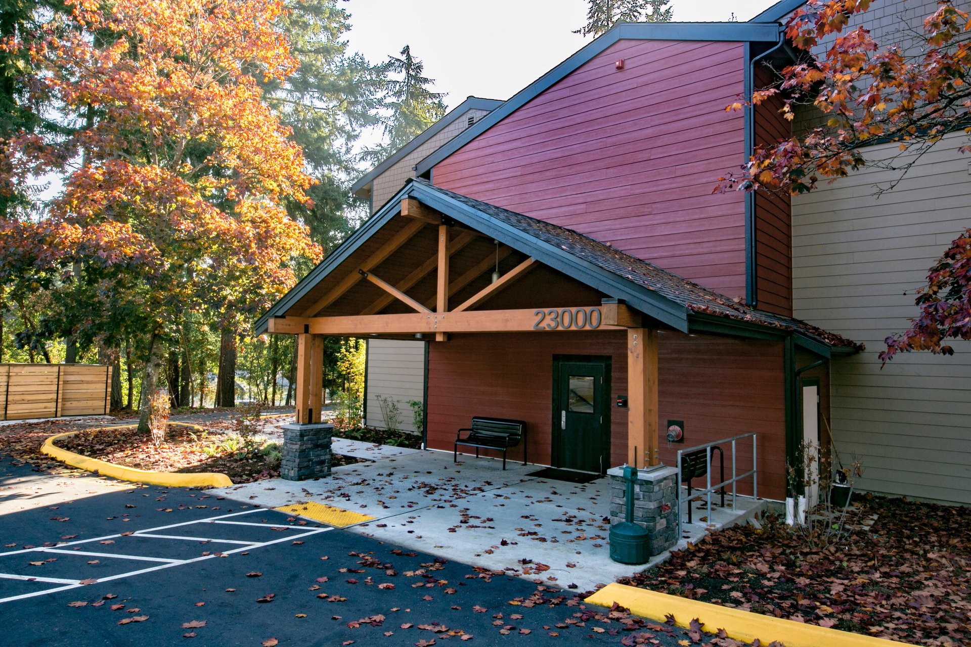 Trillium is a renovated apartment building providing affordable senior housing. Wayfinding and accessibility improvements create a clearer and safe entry experience for residents. A new stairway and pickup waiting area were added to increase welcoming and visibility to the building. A renovated community building is complimented outside by new raised planters for community gardening. Existing plantings across the site were augmented with native shrubs and trees.