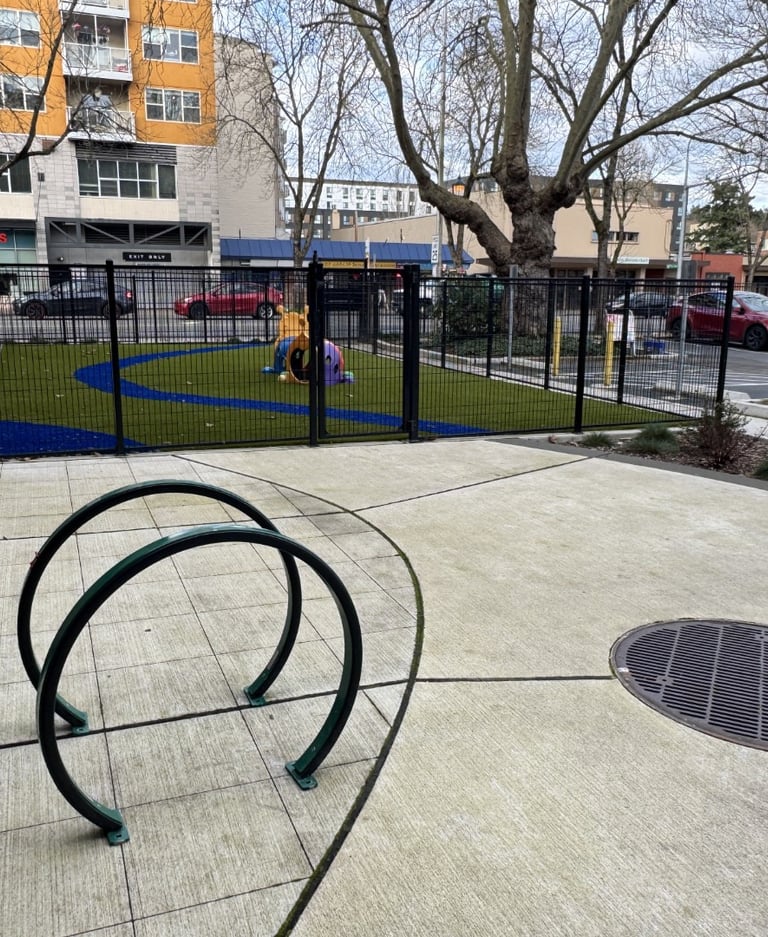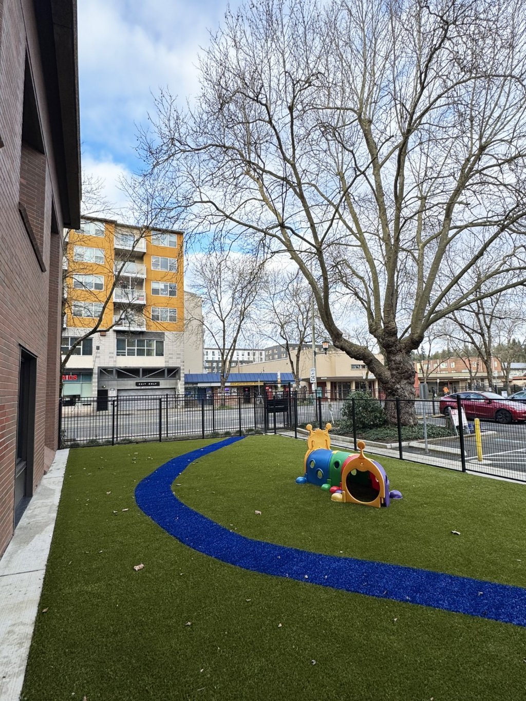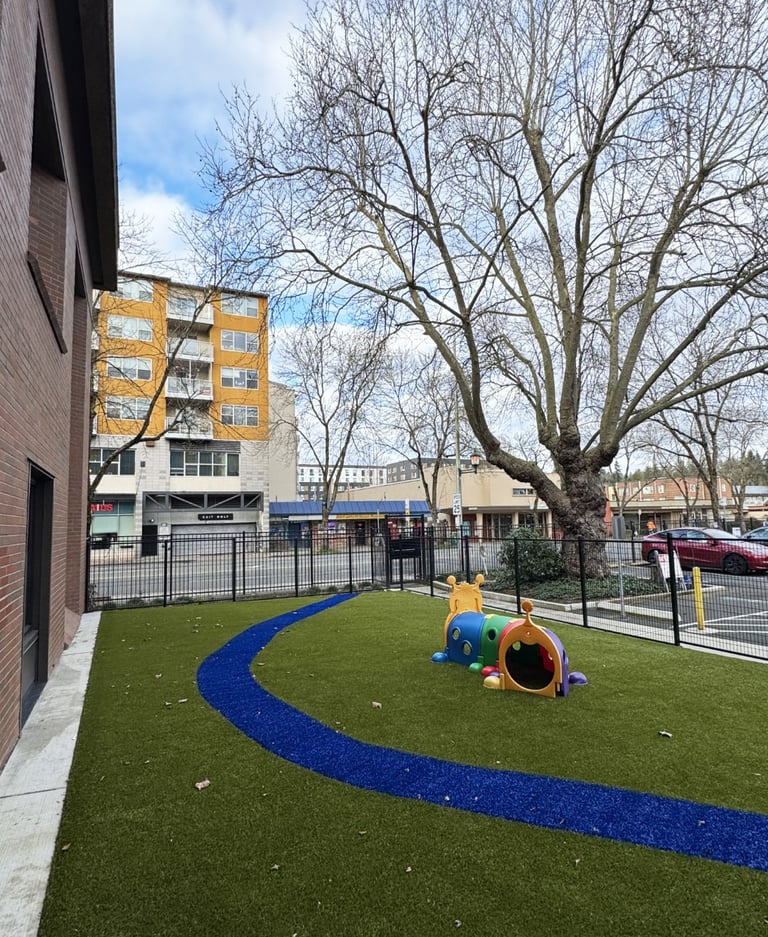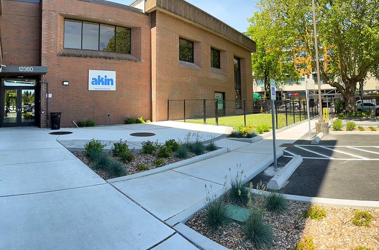 Akin is dedicated to improving the health and well-being of children and families. Their Lake City facility, with an imposing brick building and a fast-moving car-focused neighborhood, struggled to maintain safety and human scale in offering its services. A new entry path and front plaza help bring human scale and safety through a busy parking lot. A new fenced-in play area with playful synthetic turf sets up the client for future play equipment. Wire mesh and vines help to define a covered patio. New plantings, fencing, and bollards around the building create a softer, safer, and more human-scale site for kids and their families.