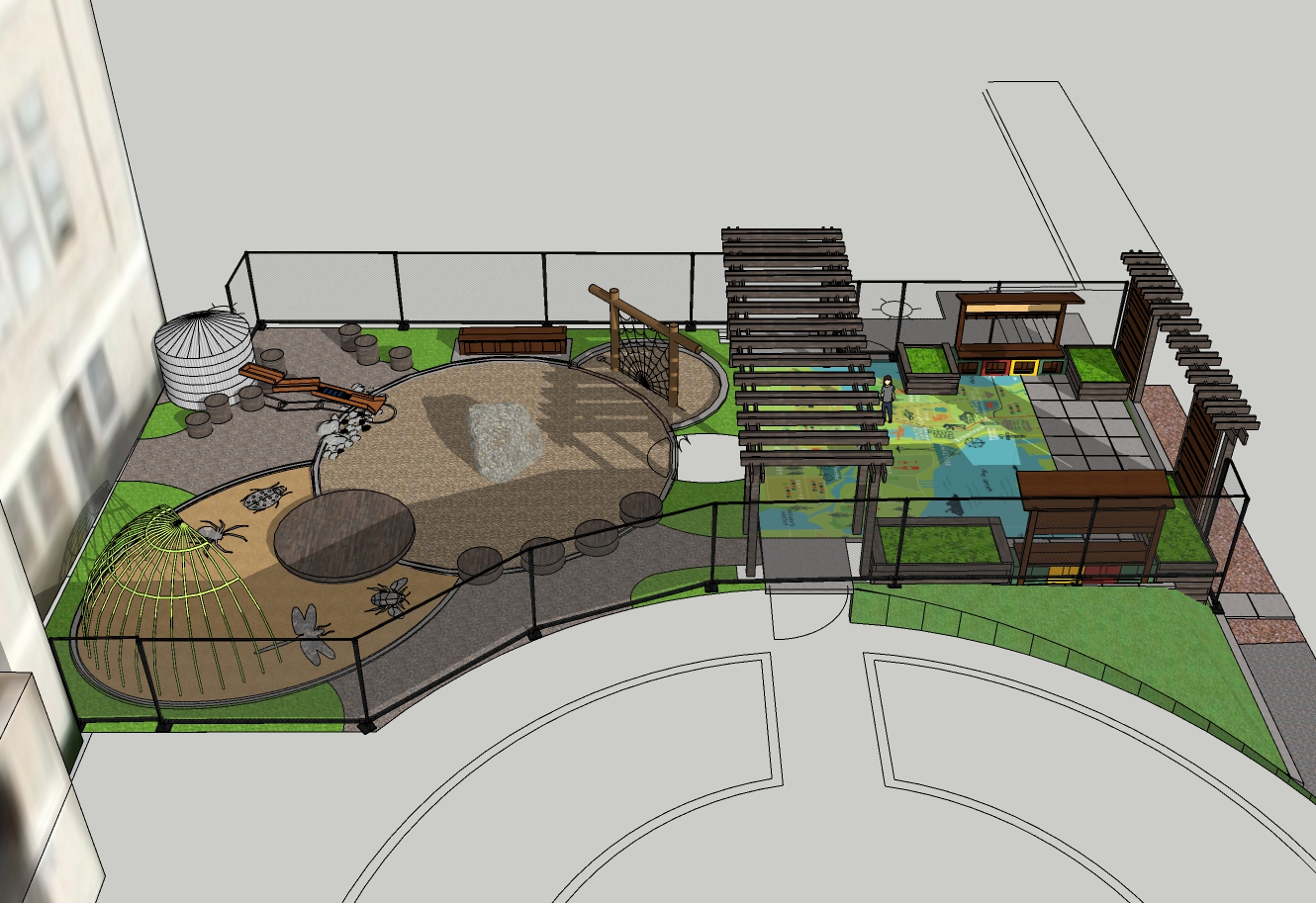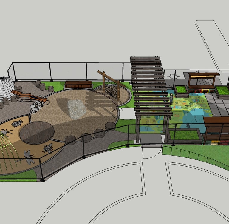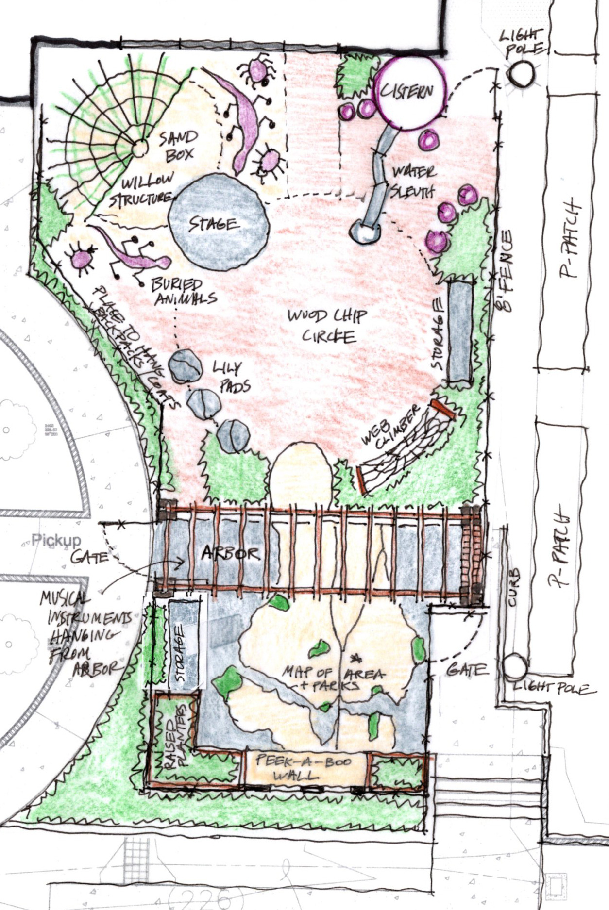 University Temple Children’s School is pursuing a new play area outside of its historic University Heights building. The play area includes an after-hours event area for parents and donors, and sits next to the University Heights P-Patch garden. The project is filled with playful and functional features, including a living willow hide-away covering a “discovery” sand pit, a water sleuth and cistern fed with potable water, a web-shaped rope climber, a peek-a-boo wall, an arbor with musical instruments, and a map of the region.